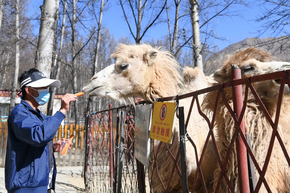 Opiekun karmi wielbłądy w zoo Chushul w Lhasie. [Zdjęcie autorstwa Kunga Lezang/China News Service]