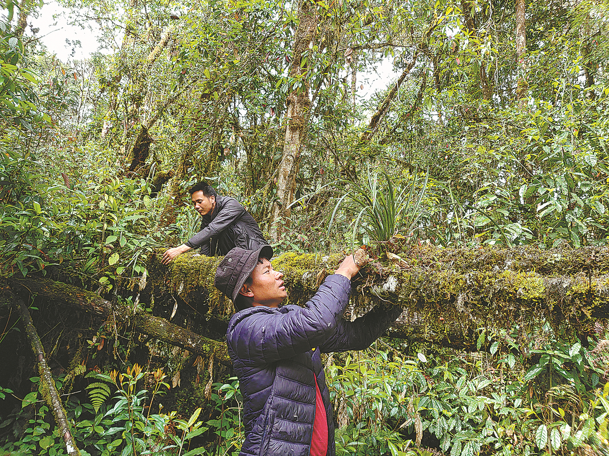 Rolnicy sadzą storczyki na pniu drzewa w lesie, aby przywrócić je naturze w powiecie Mêdog. [Zdjęcie: China Daily]