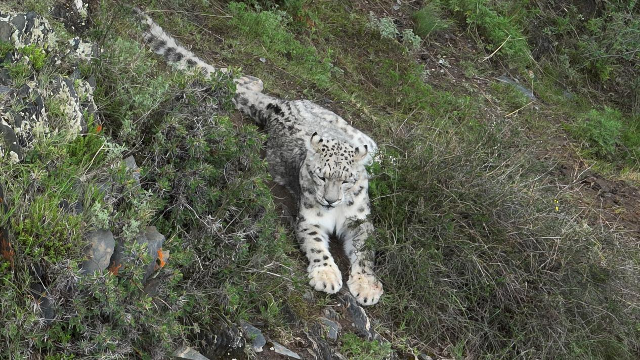 Pantera śnieżna odpoczywa na zboczu góry w gminie Bagan w powiecie Chumarle, w Tybetańskiej Prefekturze Autonomicznej Yushu, w prowincji Qinghai. (Zdjęcie / Gonggari)