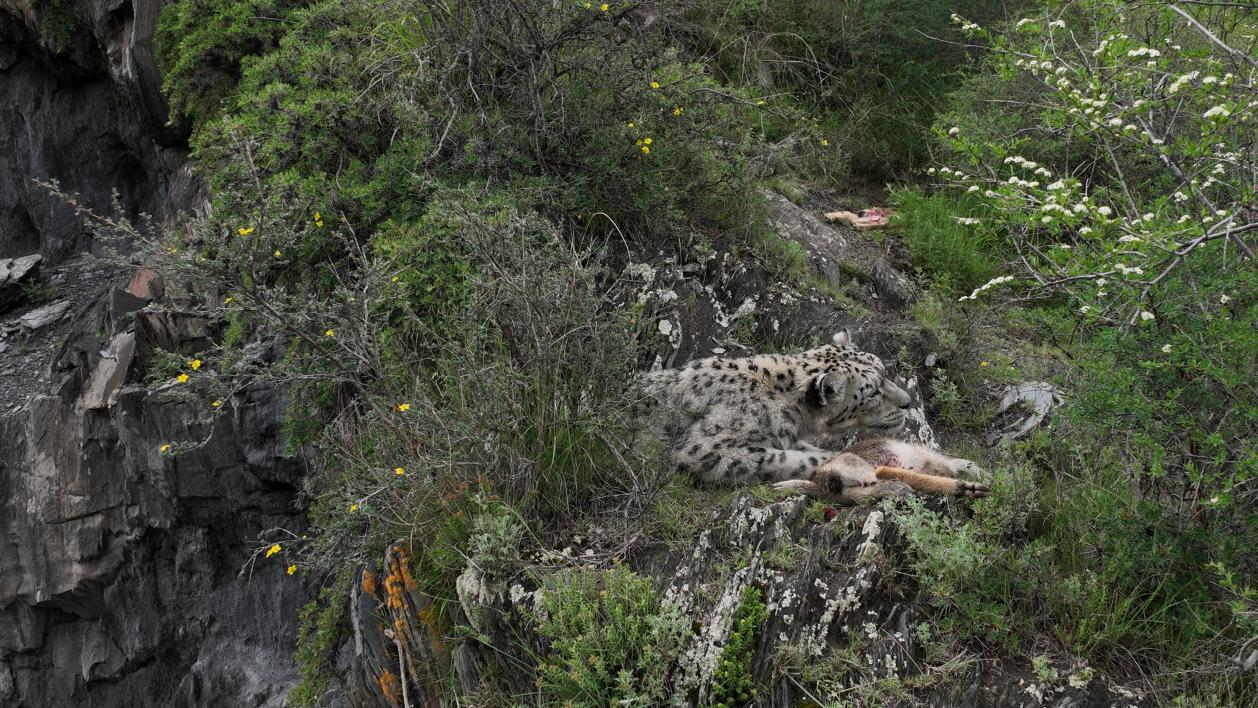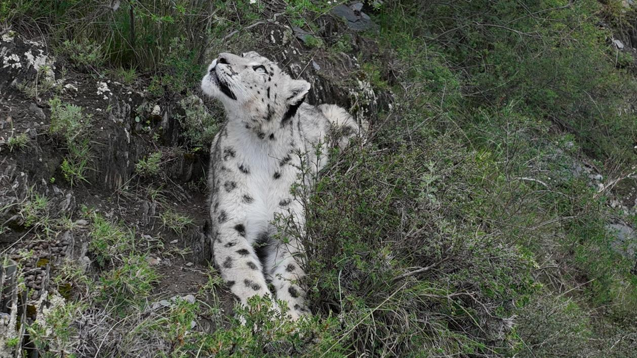 Podczas patrolu wyznaczonego obszaru gór w powiecie Chumarle w Tybetańskiej Prefekturze Autonomicznej Yushu w północno-zachodniej prowincji Qinghai jeden z członków zespołu fotograficznego złożonego z rolników i pasterzy wykonał zdjęcia pantery śnieżnej odpoczywającej na zboczu góry.
