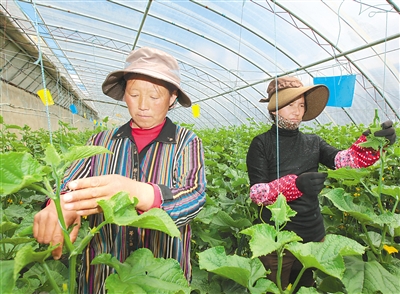 3.Plantatorzy roślin sprawdzają stan wzrostu ogórków w gospodarstwie szklarniowym warzyw i kwiatów w powiecie Doilungdeqen. [Photo / China Tybet News]