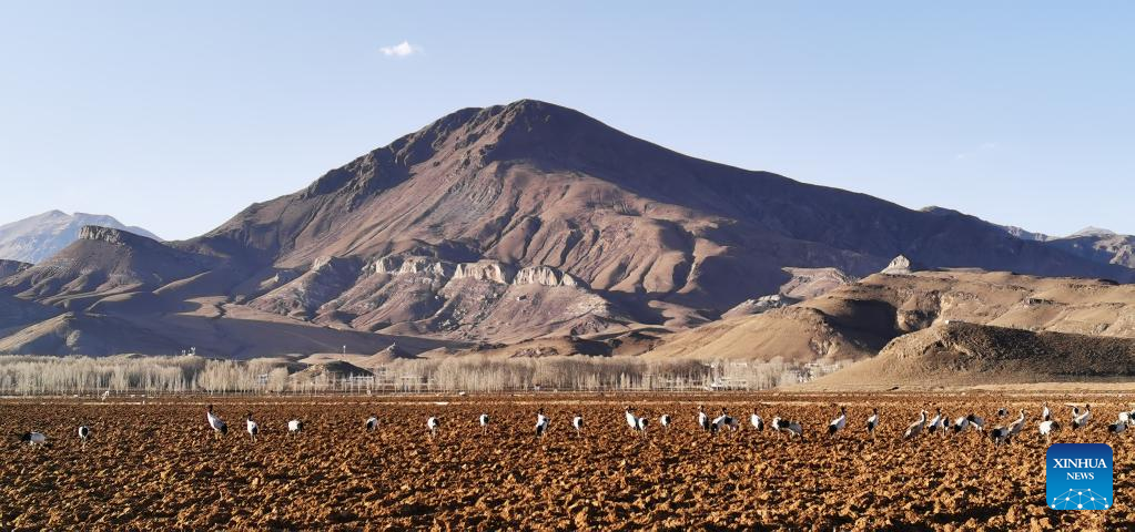 To zdjęcie zrobione telefonem komórkowym 24 grudnia 2022 r. przedstawia stado żurawi czarnoszyich w powiecie Lhunzhub w stołecznej prefekturze Lhasy, w Tybetańskim Regionie Autonomicznym. Tybetański Region Autonomiczny w południowo-zachodnich Chinach zbudował 47 rezerwatów przyrody o łącznej powierzchni około 412 200 kilometrów kwadratowych.(Xinhua/Shen Hongbing)