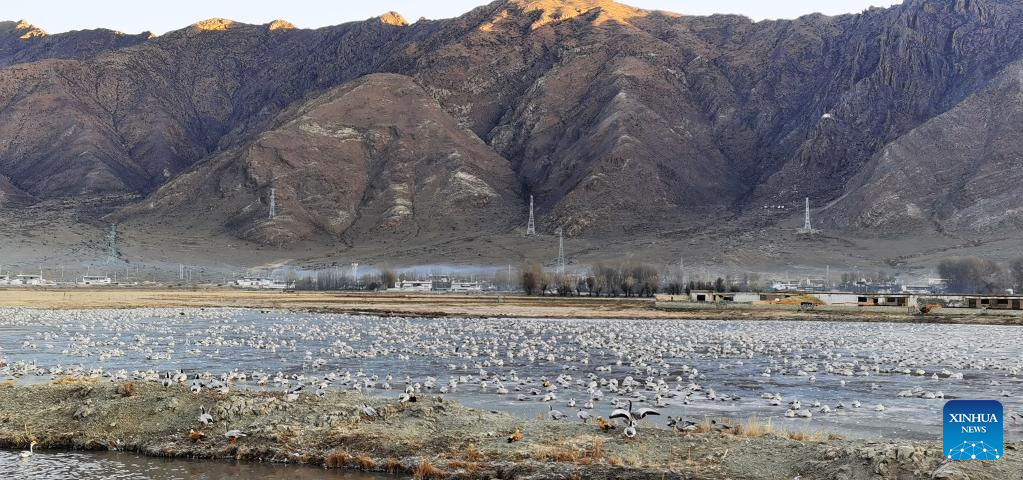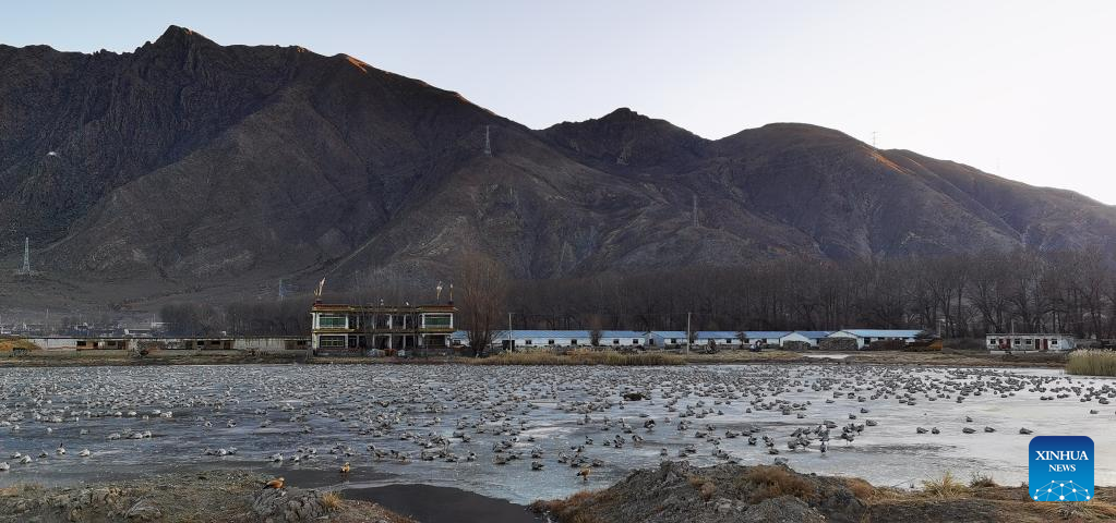 To zdjęcie zrobione telefonem komórkowym 24 grudnia 2022 r. przedstawia ptaki wędrowne w powiecie Lhunzhub w stołecznej prefekturze Lhasy, w Tybetańskim Regionie Autonomicznym. Tybetański Region Autonomiczny w południowo-zachodnich Chinach zbudował 47 rezerwatów przyrody o łącznej powierzchni około 412 200 kilometrów kwadratowych. (Xinhua/Shen Hongbing)