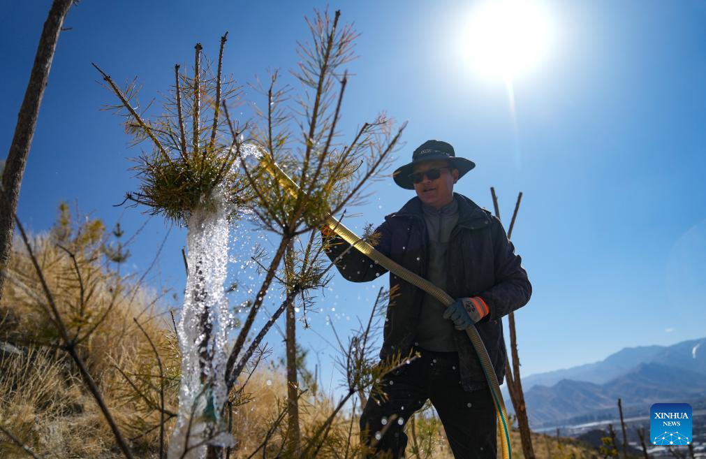 Mieszkaniec osiedla Donggar podlewa sadzonki drzew w Lhasie , 12 marca 2024 r. (Xinhua/Jigme Dorje)