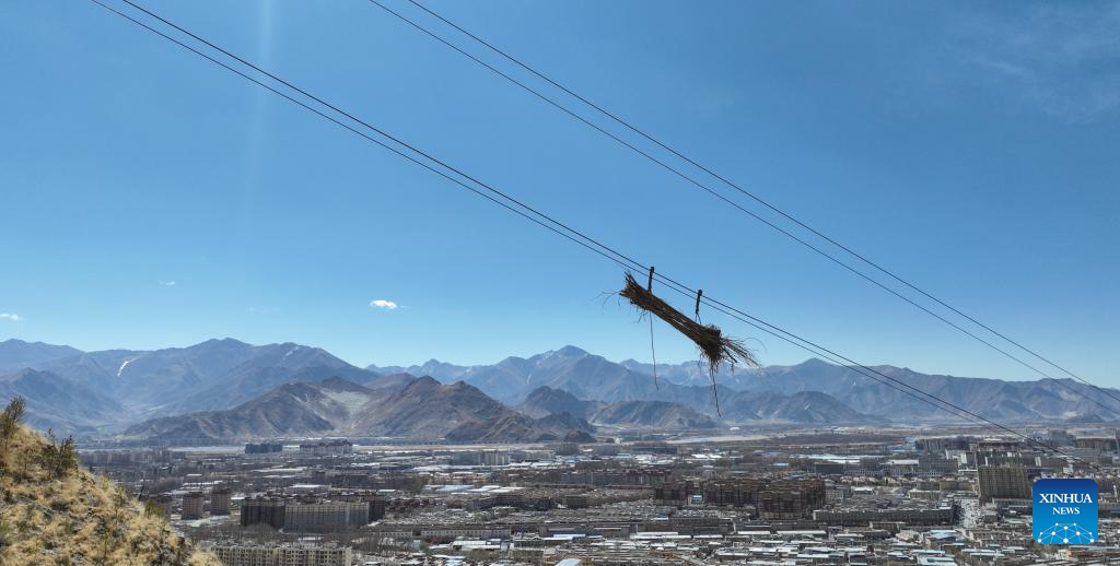Zdjęcie lotnicze zrobione 12 marca 2024 r. Przewóz sadzonek drzew kolejką linową w Lhasie, 12 marca 2024 r. (Xinhua/Tenzin Nyida)