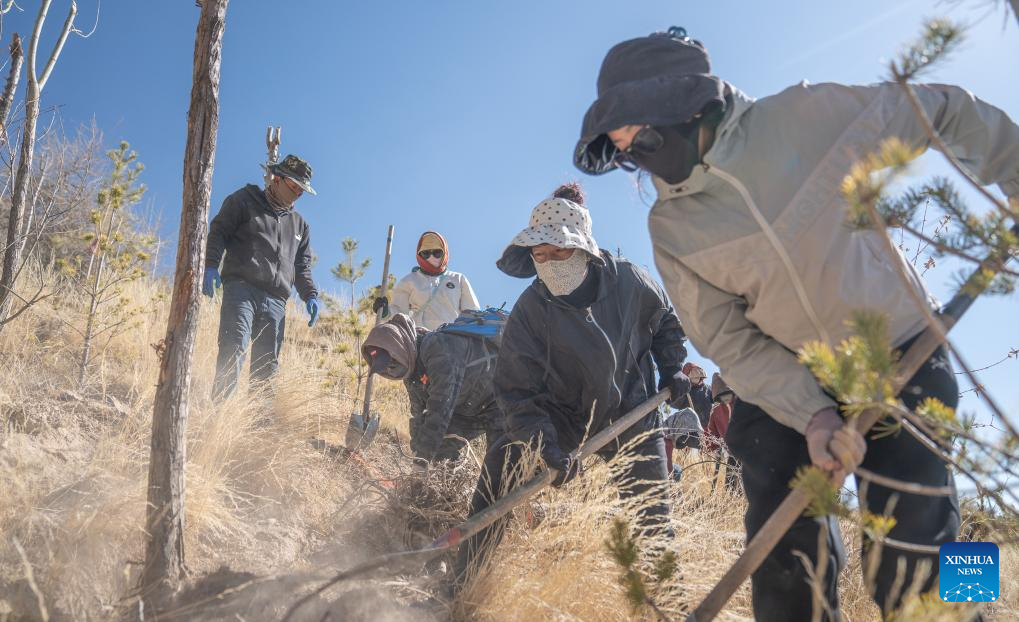 Mieszkańcy osiedla Donggar sadzą sadzonki w Lhasi, 12 marca 2024 r. (Xinhua/Jigme Dorje)
