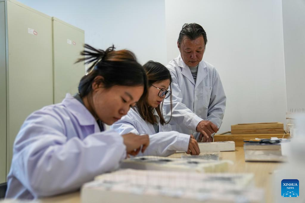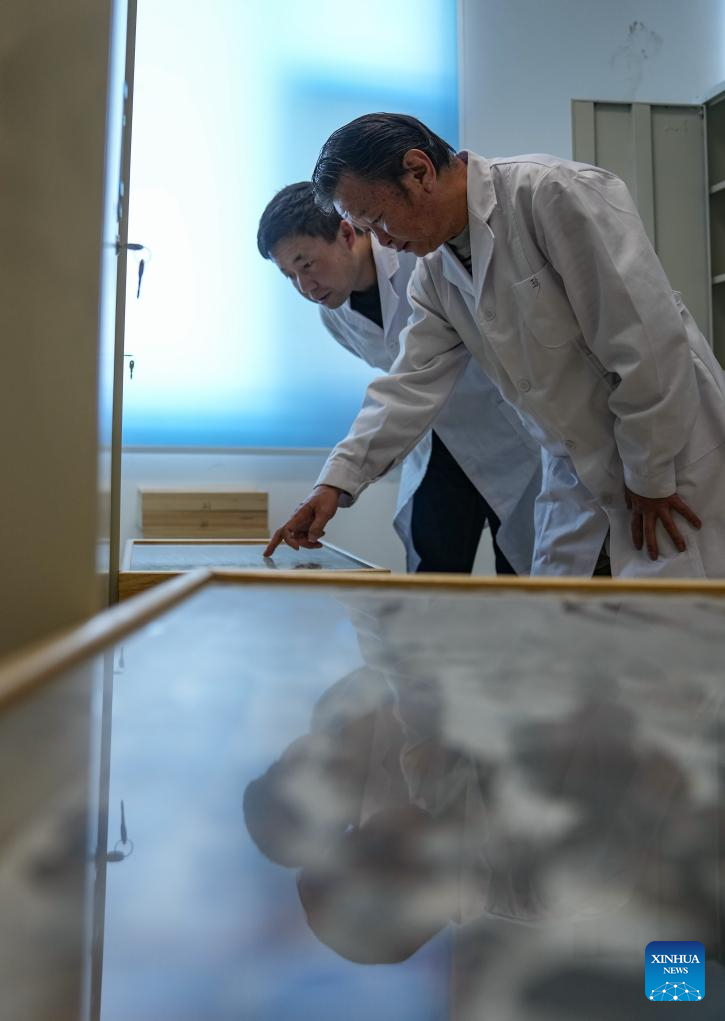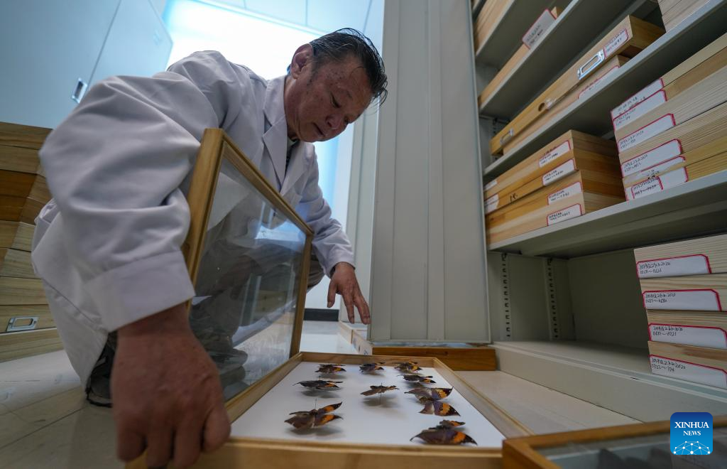 Dawa pokazuje okazy motyli w siedzibie Regionalnego Instytutu Biologii Wyżyny Tybetańskiej w Lhasie, 22 kwietnia 2024 r. 55-letni Dawa jest entomologiem, pracownikiem naukowym Regionalnego Instytutu Biologii Wyżyny Tybetańskiej w TRA. Badaniami nad klasyfikacją owadów zajmuje się od ponad 30 lat.