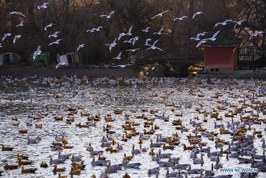 Zdjęcie z 25 grudnia 2017 r. - ptaki wędrowne na stawach w Parku Parku Smoczego Króla w Lhasie. Park jest domem dla wielu gatunków ptaków wędrownych, które przybywają tu w czasie zimy. (Foto:Xinhua / Liu Dongjun)