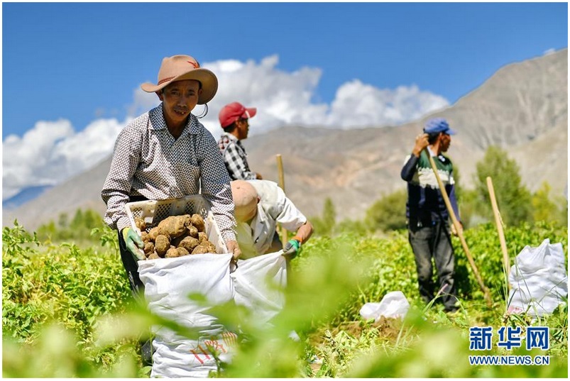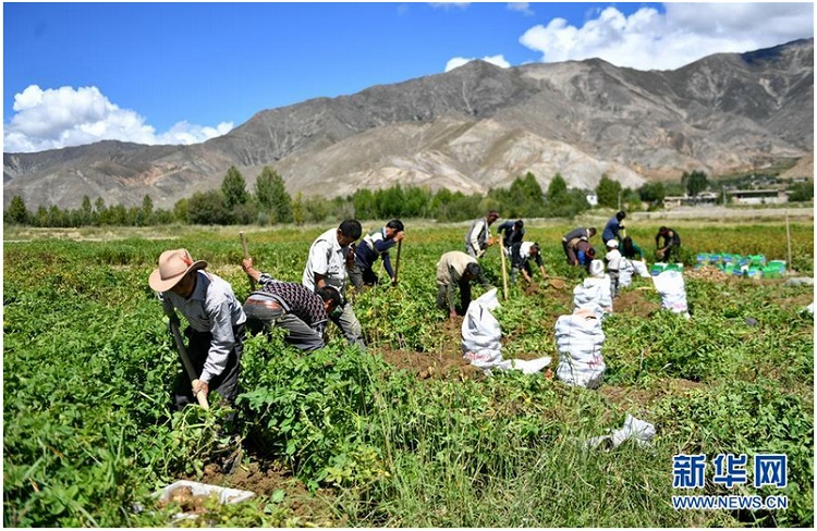 Na fotografiach przedstawiamy zbiór ziemniaków w Dongkar w prefekturze Shigatse. Ziemniaki zbierają rolnicy, członkowie Spółdzielni Chima Domqin - Ośrodka Rozwoju Rolnictwa. Przy wsparciu władz i profesjonalnej kadry z Qingdao, miasta we wschodnich Chinach` w prowincji Shandong, społeczność Dongkar stworzyła profesjonalną spółdzielnię rolniczą, która obejmuje 1048 osób z 280 gospodarstw domowych. Spółdzielcy w celu promowania ekologicznej uprawy ziemniaków zarejestrowali znak towarowy"Dongkar Potato". Podjęta działalność ma im pomóc wydobyć się ubóstwa. [Foto / Xinhua]