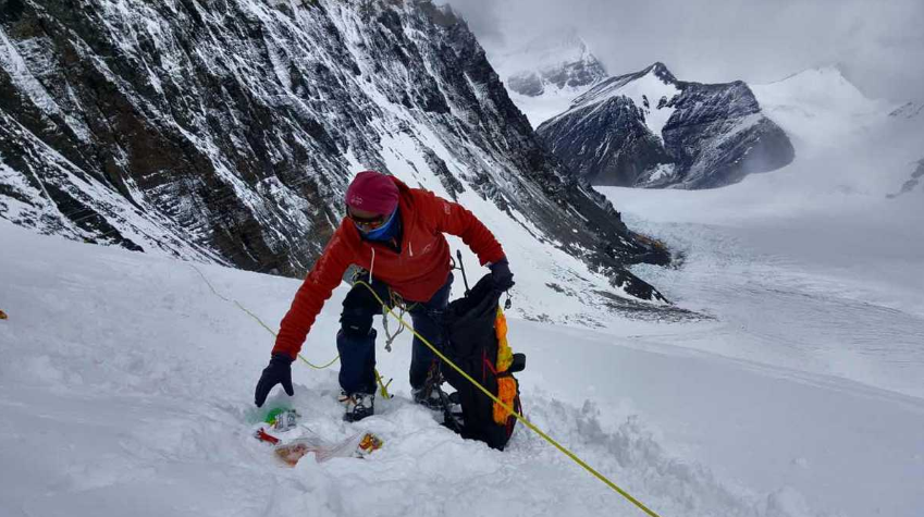 Przewodnik wspinaczkowy z Tybetu robi porządki na wysokości 7928 metrów pod Qomolangma w maju 2018 roku.