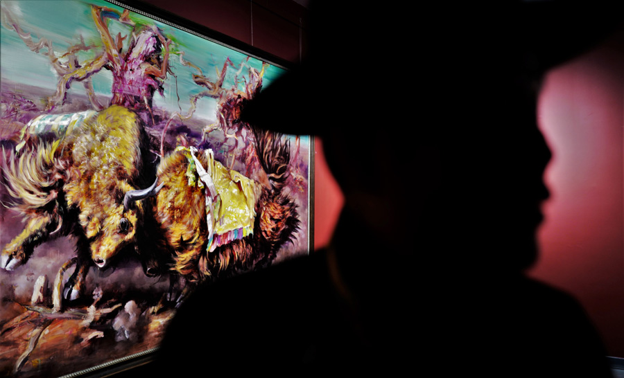 Wu Yuchu odwiedza wystawę obrazów olejnych o tematyce związanej z jakami w Museum Yaków w Lhasie, stolicy Tybetu. (Zdjęcie / Xinhua)