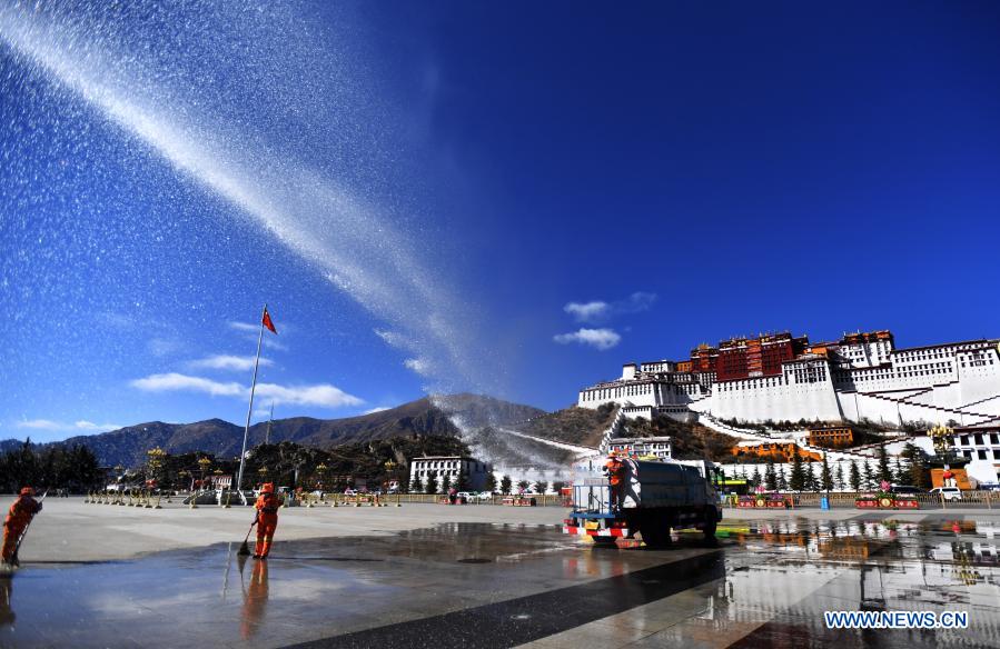 Noworoczne porządki na placu Pałacu Potala w Lhasie, 8 lutego 2021 r. Tego roku zarówno Święto Wiosny, jak i Tybetański Nowy Rok przypadają 12 lutego. (Foto:Xinhua / Chogo)