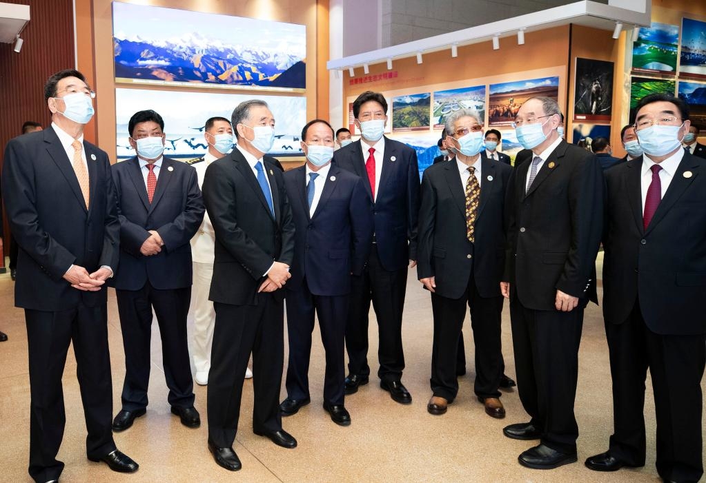 Wang Yang, członek Stałego Komitetu Biura Politycznego Komitetu Centralnego Komunistycznej Partii Chin (KPCh) i przewodniczący Komitetu Narodowego Chińskiej Ludowej Politycznej Konferencji Konsultacyjnej, prowadzi wszystkich członków delegacji władz centralnych do Muzeum Tybetu w Lhasie na ceremonię otwarcia wystawy na temat osiągnięć dokonanych w ciągu 70 lat od pokojowego wyzwolenia Tybetu. Delegacja centralnych władz ChRL pod przewodnictwem Wanga przybyła do Lhasy, aby wziąć udział w obchodach 70. rocznicy pokojowego wyzwolenia Tybetu, 18 sierpnia 2021 r. (Xinhua/Huang Jingwen)