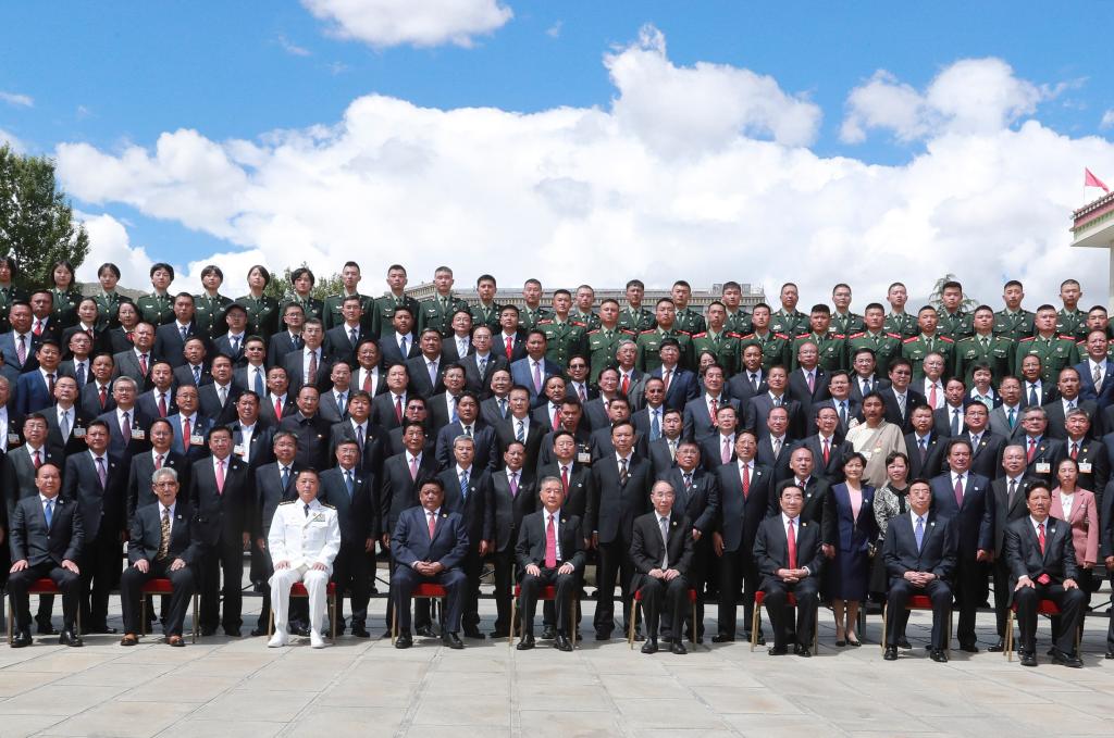 Wang Yang, członek Stałego Komitetu Biura Politycznego Komitetu Centralnego Komunistycznej Partii Chin (KPCh) i przewodniczący Komitetu Narodowego Chińskiej Ludowej Politycznej Konferencji Konsultacyjnej, który stał na czele delegacji władz centralnych na uroczystości rocznicowe w Tybecie, pozuje do zdjęcia grupowego po wielkiej gali z okazji 70. rocznicy pokojowego wyzwolenia Tybetu, 19 sierpnia 2021 r. [Zdjęcie/Xinhua]