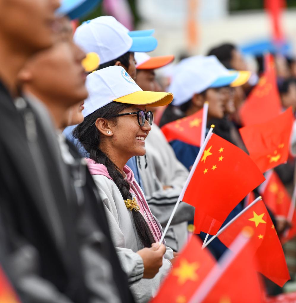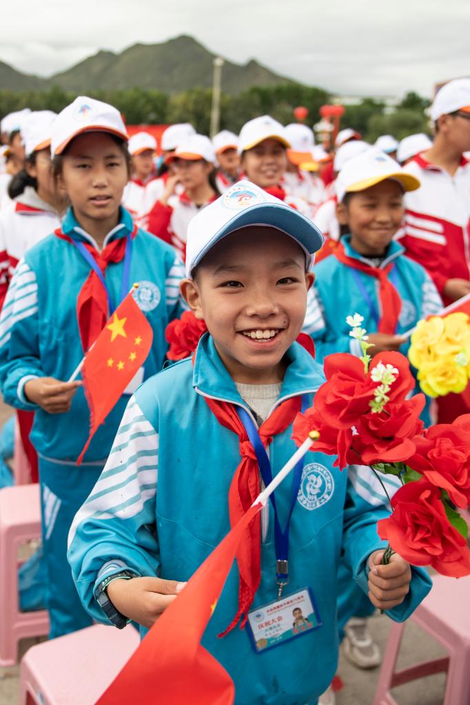 Uczniowie biorący udział w wielkim zgromadzeniu z okazji 70. rocznicy pokojowego wyzwolenia Tybetu na placu Pałacu Potala w Lhasie, 19 sierpnia 2021 r. [Zdjęcie/Xinhua]