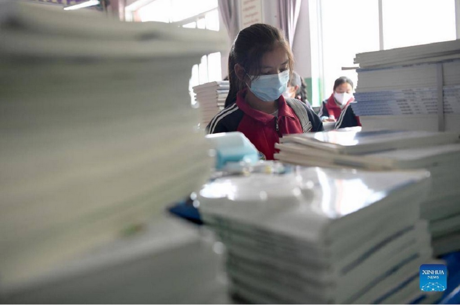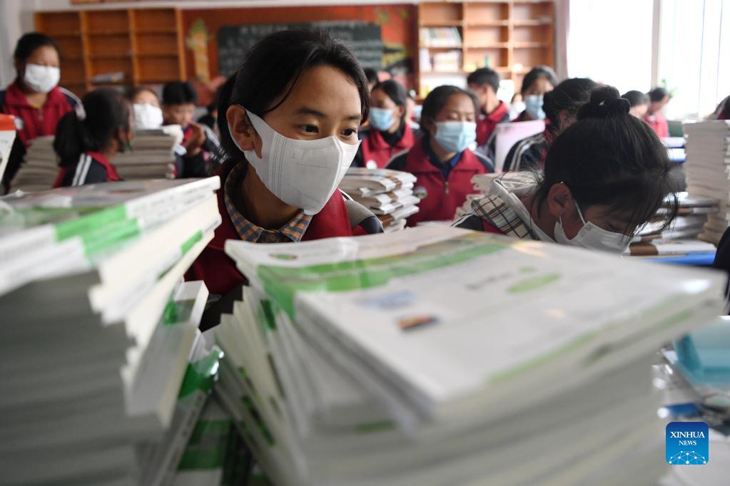 Uczennica pobiera nowe podręczniki w tybetańskiej szkole średniej w Luqu , w Tybetańskiej Prefekturze Autonomicznej Gannan, w prowincji Gansu, 30 sierpnia 2021 r. (Xinhua/Du Zheyu)