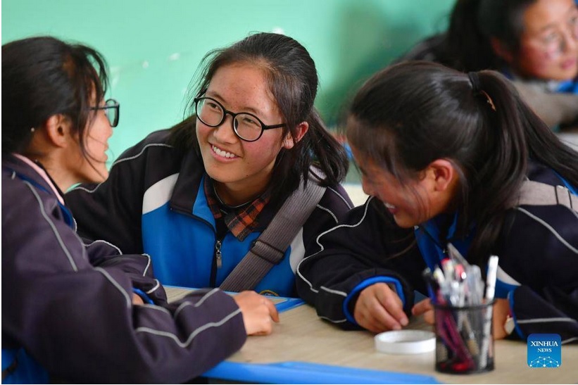 Uczennice podczas powakacyjnych rozmów w internacie Tybetańskiej Szkoły Średniej w Luqu, 30 sierpnia 2021 r. (Xinhua/Chen Bin)