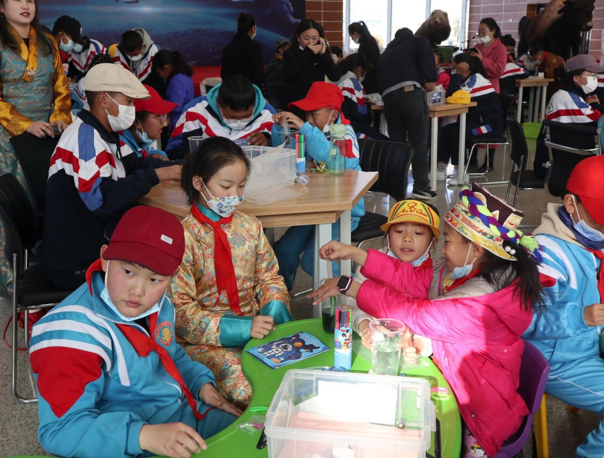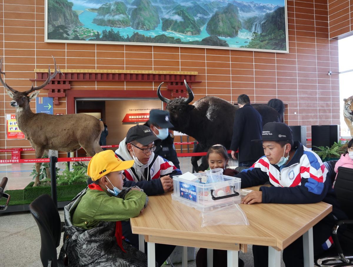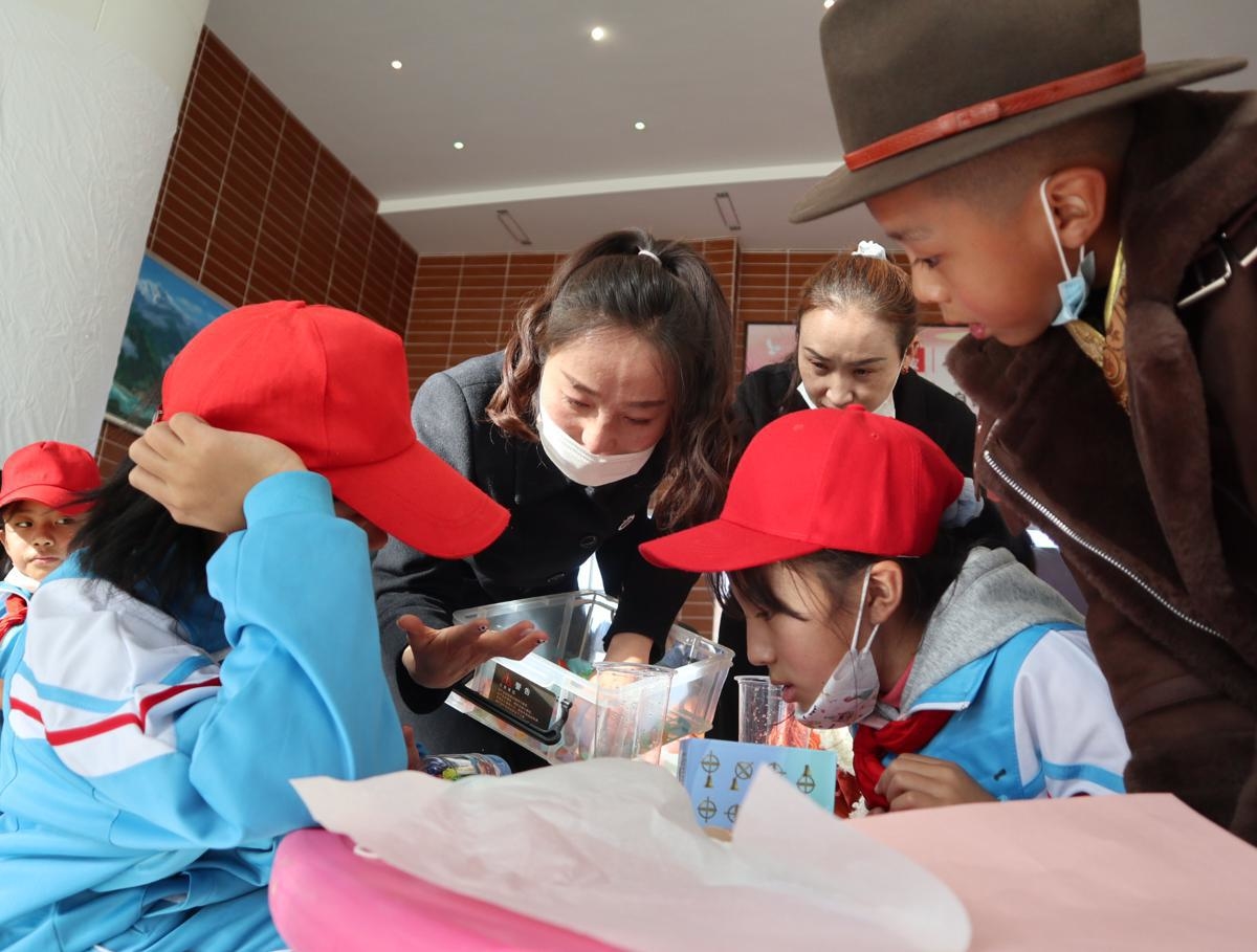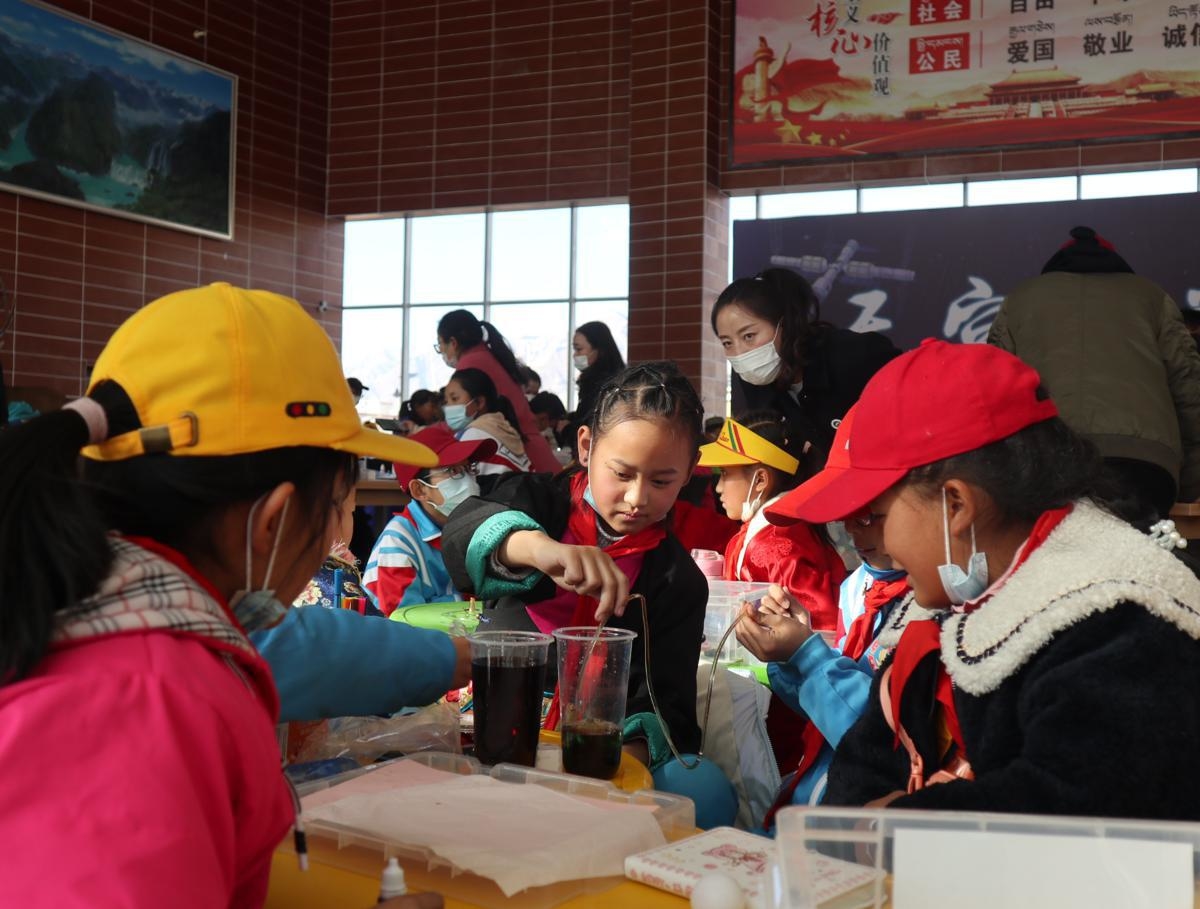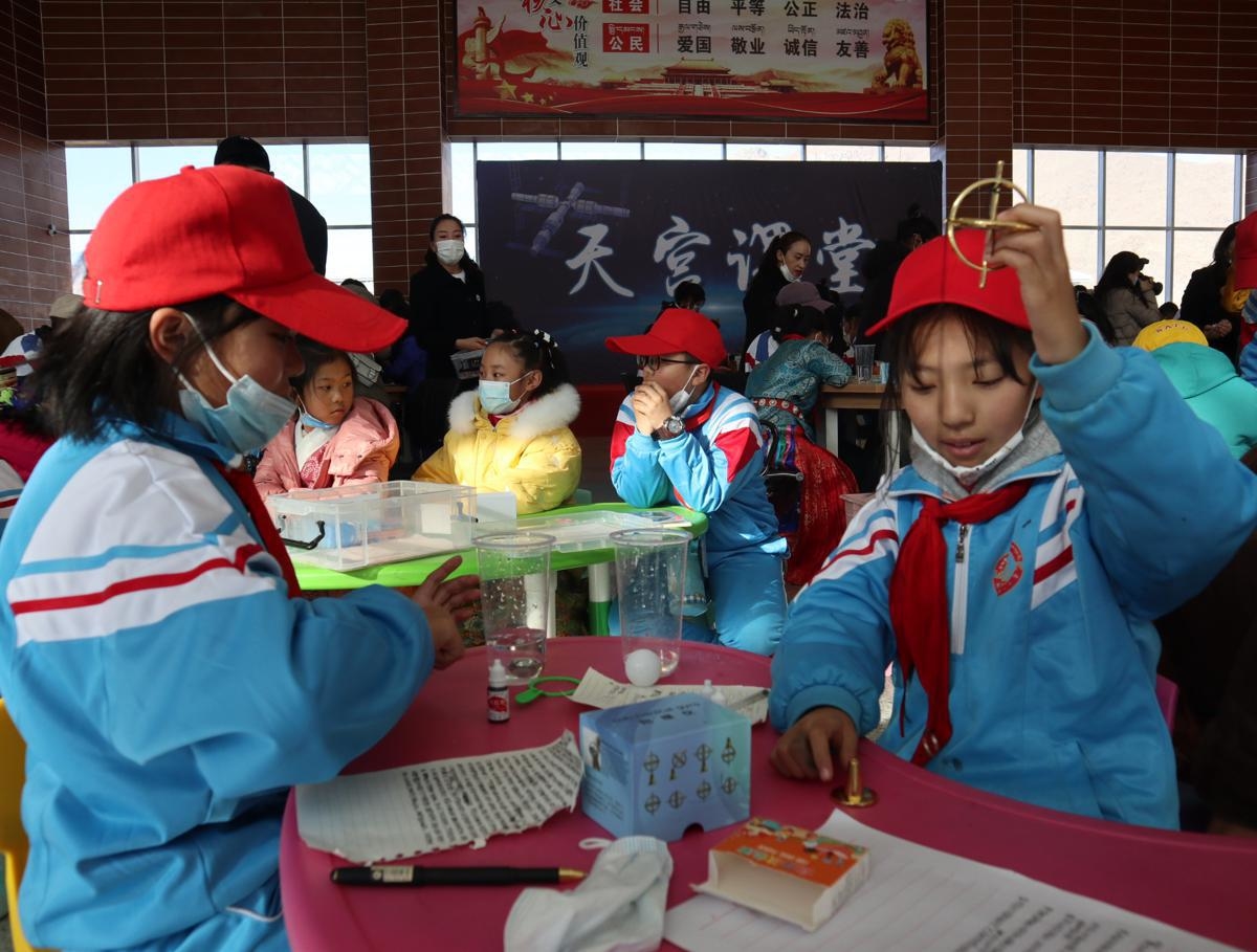 Uczniowie w Tybecie przeprowadzają eksperyment podczas lekcji na żywo prowadzonej przez członków załogi na pokładzie Shenzhou XIII w czwartek. [Zdjęcie autorstwa Palden Nyima/chinadaily.com.cn]