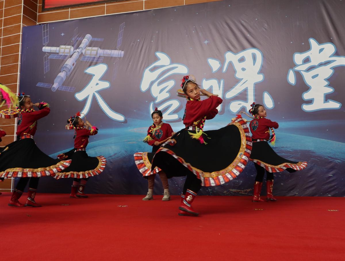 Uczniowie z Lhasy w autonomicznym regionie Tybetu wykonują tradycyjny tybetański taniec, uczestnicząc w zajęciach na żywo prowadzonych przez członków załogi Shenzhou XIII w czwartek. [Zdjęcie autorstwa Palden Nyima/chinadaily.com.cn]