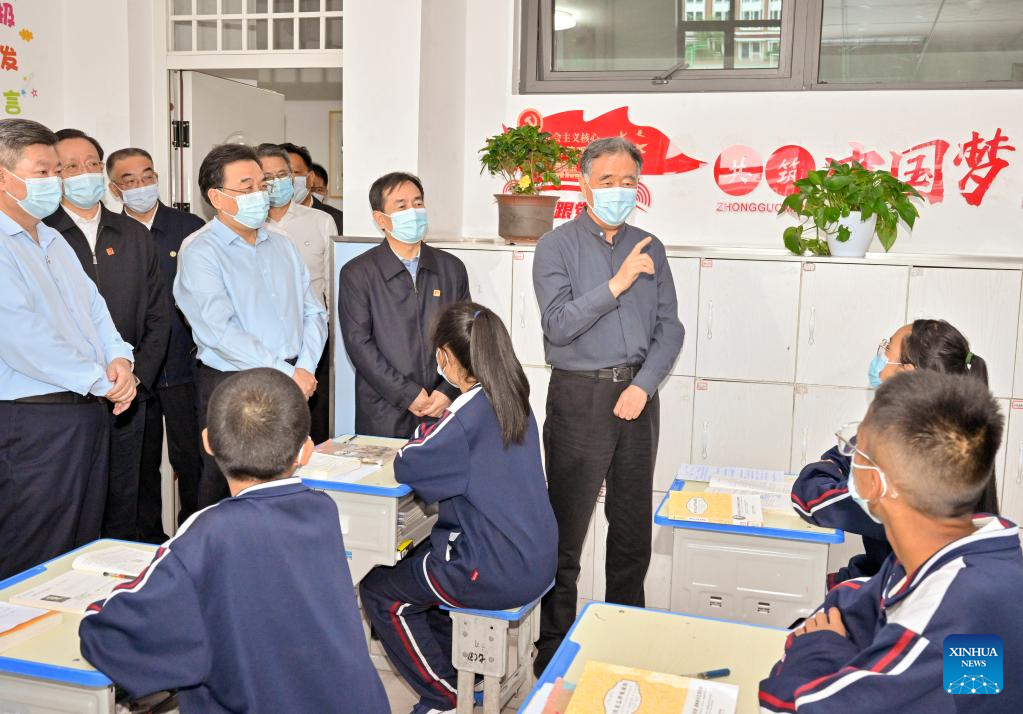 Wang Yang, członek Stałego Komitetu Biura Politycznego Komitetu Centralnego Komunistycznej Partii Chin (KPCh) i przewodniczący Komitetu Narodowego Chińskiej Ludowej Politycznej Konferencji Konsultacyjnej, odwiedza gimnazjum wspierane przez Szanghaj, aby dowiedzieć się o jej sytuacji - Tybetańska Prefektura Autonomiczna Huangnan, prowincja Qinghai w północno-zachodnich Chinach, 27 czerwca 2022 r. Wang odbył podróż inspekcyjną do stolicy prowincji Xining i do Tybetańskiej Prefektury Autonomicznej Huangnan. (Xinhua/Gao Jie)