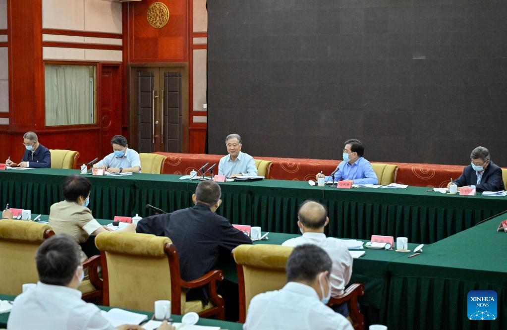 Wang Yang, członek Stałego Komitetu Biura Politycznego Komitetu Centralnego Komunistycznej Partii Chin (KPCh) i przewodniczący Komitetu Narodowego Chińskiej Ludowej Politycznej Konferencji Konsultacyjnej, przewodniczy spotkaniu w sprawie nadzoru i konsultacji kluczowych propozycji dotyczących ochrony i utrzymania dziedzictwa historycznego i kulturowego [Tybetańczyków] w trakcie planowania i budowy na obszarach miejskich i wiejskich, w Xining, w prowincji Qinghai w północno-zachodnich Chinach, 29 czerwca 2022 r. Wang odbył podróż inspekcyjną do stolicy prowincji Qinghai - Xining i Tybetańskiej Prefektury Autonomicznej Huangnan. (Xinhua/Gao Jie)