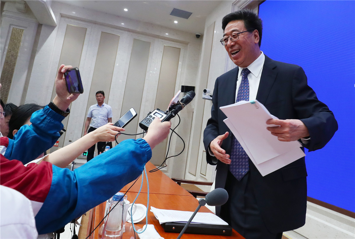 Wu Yingjie, przewodniczący Komunistycznej Partii Chin w Tybetańskim Regionie Autonomicznym, odpowiada na pytania dziennikarzy na konferencji prasowej [Zdjęcie Zhu Xingxin / chinadaily.com.cn]
