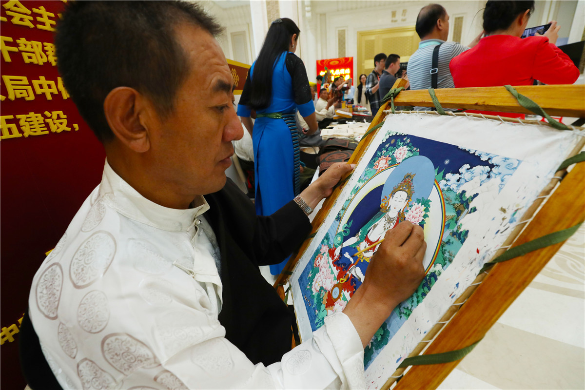 Tybetański rzemieślnik maluje thangkę - klasyczny obraz buddyzmu tybetańskiego . [Zdjęcie Zhu Xingxin / chinadaily.com.cn]
