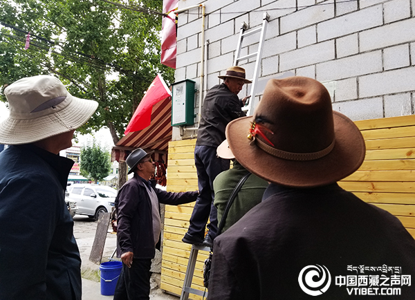 Przed dniem święta 70-tej rocznicy powstania Chińskiej Republiki Ludowej, mieszkańcy Ngabaling uprzątają mury budynków ze zbędnych elementów. (Zdjęcie: VTIBET.com)