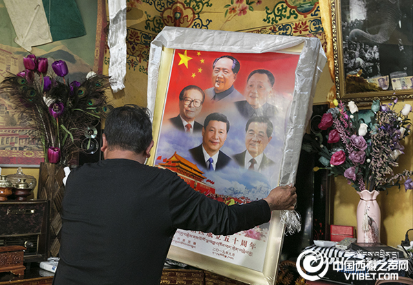 Gyatso, mieszkaniec osiedla Barkhor zawiesza tradycyjny tybetański szal khada (kawałek jedwabiu używany jako prezent powitalny) na fotografii przywódców ChRL. (Zdjęcie: VTIBET.com)
