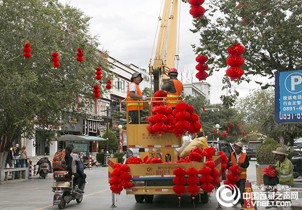 Pracownicy służb miejskich zawieszają czerwone lampiony na drzewach rosnących wzdłuż ulicy. Każda ulica w Lhasie jest ozdobiona czerwonymi latarniami.