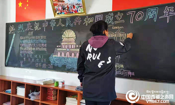 Nauczyciele zdobią tablicę z okazji 70-tej rocznicy powstania Nowych Chin. (Zdjęcie: VTIBET.com)