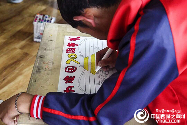 Z okazji święta uczeń szkoły Dyolong Dechen tworzy okolicznościowy rysunek. (Zdjęcie: VTIBET.com)