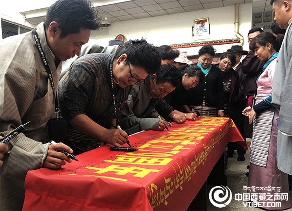 Mieszkańcy osiedla Barkhor podpisują życzenia na transparencie z okazji 70-tej rocznicy założenia Chińskiej Republiki Ludowej. (Zdjęcie: VTIBET.com)
