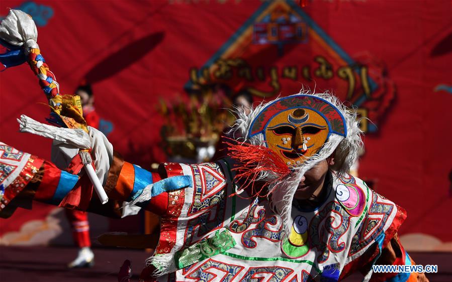 25 stycznia 2020 r., pierwszy dzień chińskiego Nowego Roku Księżycowego. Aktor Opery Tybetańskiej podczas spektaklu w dzielnicy Doilungdeqen w Lhasie (Foto: Xinhua / Chogo)