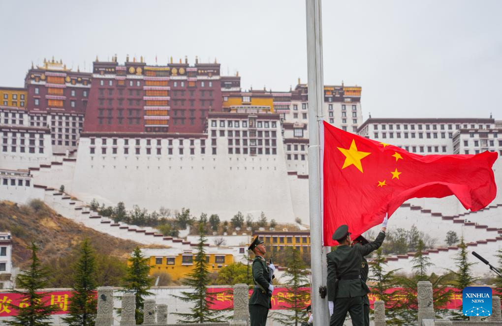 Ceremonia podniesienia flagi z okazji Dnia Wyzwolenia Chłopów Pańszczyźnianych na placu przed Pałacem Potala w Lhasie, stolicy Tybetańskiego Regionu Autonomicznego Regionu [Xizang] w południowo-zachodnich Chinach, 28 marca 2026 r.
